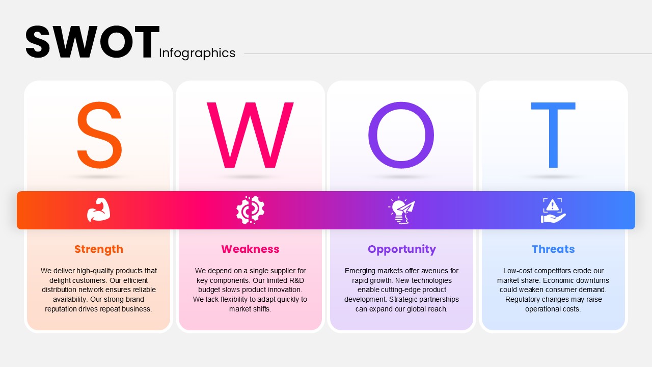 Visually present your SWOT analysis with a sleek, modern infographic layout. Each quadrant is distinctively colored—Strength in vibrant orange, Weakness in pink, Opportunity in purple, and Threats in blue—making it easy for your audience to quickly digest key information. Bold, large typography highlights each SWOT component, while meaningful icons below the letters symbolize the core ideas. The transition between sections is smooth, with a central gradient bar tying the elements together in a cohesive and professional design.