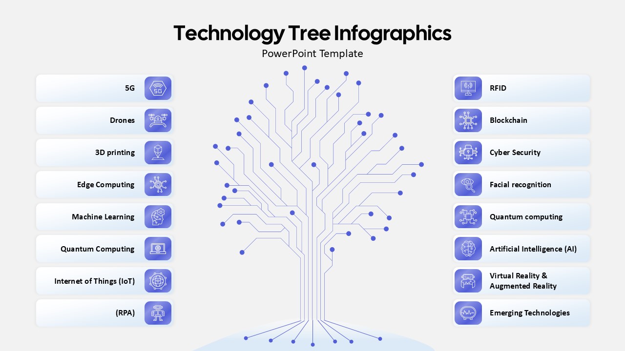 The template uses a sleek blue theme across the tree structure and the text holders. This color choice reflects the digital and professional tone associated with technology, while ensuring high readability and visual consistency throughout the slide.