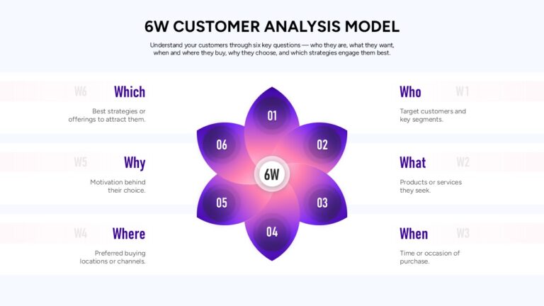 Unveil the essence of customer understanding with this 6W Customer Analysis Model Template for PowerPoint and Google Slides. This visually captivating slide uses a six-petal flower design to represent the six fundamental questions of customer analysis — Who, What, When, Where, Why, and Which. Each segment radiates from a central “6W” core, emphasizing how every question interconnects to form a complete customer insight framework. The gradient shades of purple and pink add a professional yet modern appeal, ideal for marketing and business strategy presentations.