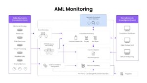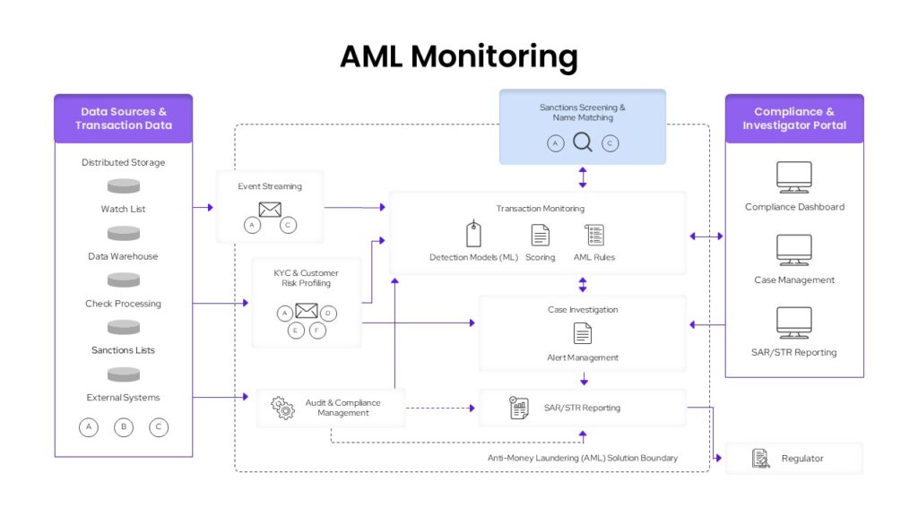 AML software vendors present this to prospects during sales demos. It maps directly to how RegTech platforms are structured, so vendors can overlay their product capabilities onto each component in the diagram: “our ML models sit here, our case management sits here, our SAR filing module connects here.”
