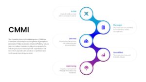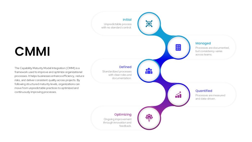 This CMMI Process Maturity Model infographic presents a clear, structured overview of how organizations evolve their processes across five progressive maturity levels: Initial, Managed, Defined, Quantified, and Optimizing. The slide uses a vertical, connected flow with rounded nodes and intuitive icons to visually guide viewers through each stage of process maturity. Subtle gradients and soft shadows add depth while maintaining a clean, professional appearance suitable for executive and technical audiences alike. Each level includes concise supporting text, making it easy to explain complex governance and quality concepts without overwhelming the audience. The balanced layout ensures strong visual hierarchy, helping presenters emphasize progression, dependencies, and continuous improvement in a single glance.