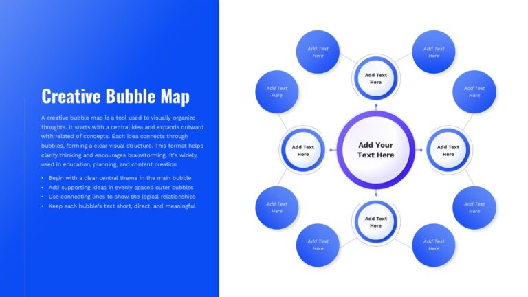 This Creative Bubble Mind Map Template for PowerPoint and Google Slides offers a clean, engaging, and visual way to organize ideas, concepts, or brainstorming sessions. The layout features a central bubble for the main topic surrounded by evenly spaced outer circles connected with thin lines, representing related ideas or supporting concepts. Each bubble includes editable placeholders, allowing users to quickly customize text and adapt the diagram to their specific presentation needs.