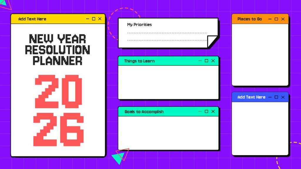 This free creative New Year Resolution Planner template is designed to help individuals and teams visualize goals, priorities, and personal growth plans for the year ahead. The layout features multiple structured sections such as priorities, things to learn, goals to accomplish, and places to go, presented through playful window-style cards, grid notebooks, and sticky-note inspired panels. Bold typography, vibrant backgrounds, and modern graphic elements create an engaging experience that encourages reflection and motivation. Each slide is fully editable, allowing users to customize text, colors, and layouts effortlessly while maintaining visual consistency. Optimized for PowerPoint and Google Slides, the template ensures smooth formatting, sharp resolution, and quick customization across devices, making goal planning both efficient and visually appealing.