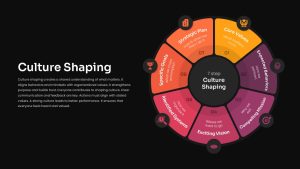 The circular layout visually represents the cyclical nature of culture shaping, making it clear that culture is a continuous, evolving process. This slide is perfect for leadership presentations, workshops, or team-building sessions focused on improving organizational culture, enhancing communication, and aligning behavior with company goals. It’s an ideal tool for HR professionals, managers, and organizational development teams.