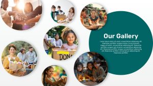 Leverage this versatile charity and volunteer program deck to inspire donors, showcase impact, and drive community engagement. The clean white canvas is punctuated by bold teal and orange circular cut-outs that frame large photos of volunteers in action. A dynamic gallery slide uses overlapping circular image placeholders to highlight key moments, while “What We Do” and PC mockup layouts pair full-bleed photography with icon-driven text blocks for program overviews.