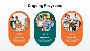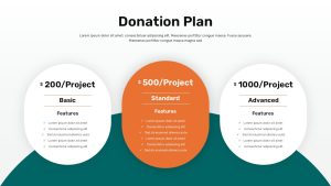 Detail your donation tiers with the three-circle “Donation Plan” slide—complete with basic, standard, and advanced giving options—then illustrate ongoing programs with percentage callouts atop color-blocked ovals. Map your global outreach on the dotted world map slide, and introduce your volunteer team using circular headshots under a curved header. Include a full-screen quote slide for testimonials and close with a heartfelt “Thank You” photo layout.