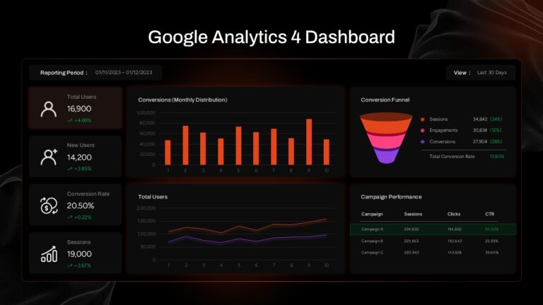 This comprehensive Google Analytics 4 (GA4) dashboard template provides a professional solution for presenting web analytics data in both dark and light themes. The template features essential KPI cards displaying total users, new users, conversion rates, and sessions with growth indicators. It includes interactive charts showing conversions monthly distribution, user trends over time, a conversion funnel visualization, and campaign performance tables. Both slides maintain identical layouts with fully editable placeholders, allowing you to customize metrics, dates, and campaign data to match your specific analytics needs.