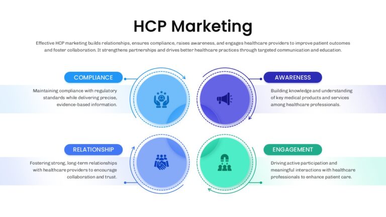 Beyond HCP marketing, this framework can be reused to present stakeholder engagement models, compliance-driven communication strategies, training frameworks, or customer experience pillars. It works well in strategy decks, internal workshops, onboarding presentations, and executive summaries.