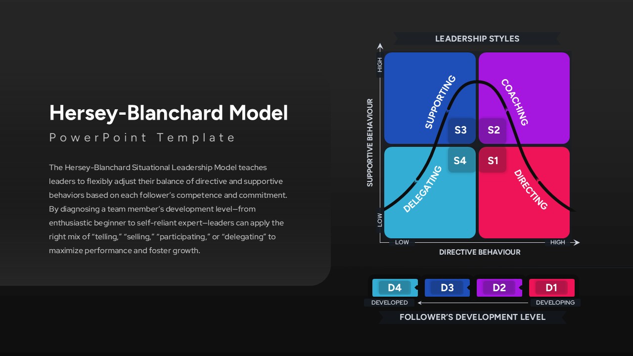 The Hersey-Blanchard Situational Leadership Model template provides a structured framework for leaders to assess and adapt their leadership style according to the competence and commitment of their followers. This slide visually represents four distinct leadership styles—Directing, Coaching, Supporting, and Delegating—arranged within a matrix of directive behavior versus supportive behavior. The corresponding follower development levels (D1 to D4) are also clearly presented to show the balance between the leader’s actions and the follower’s growth stage. This layout aids in fostering improved team management and leadership effectiveness.
