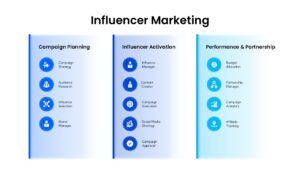 This influencer marketing template provides a structured framework for planning, executing, and measuring influencer campaigns. The template breaks down the entire process into three critical phases: campaign planning, influencer activation, and performance tracking. It helps teams define roles, responsibilities, and workflows across campaign strategy, audience research, influencer selection, content creation, and analytics. The template includes both light and dark versions to match your presentation needs and brand guidelines.