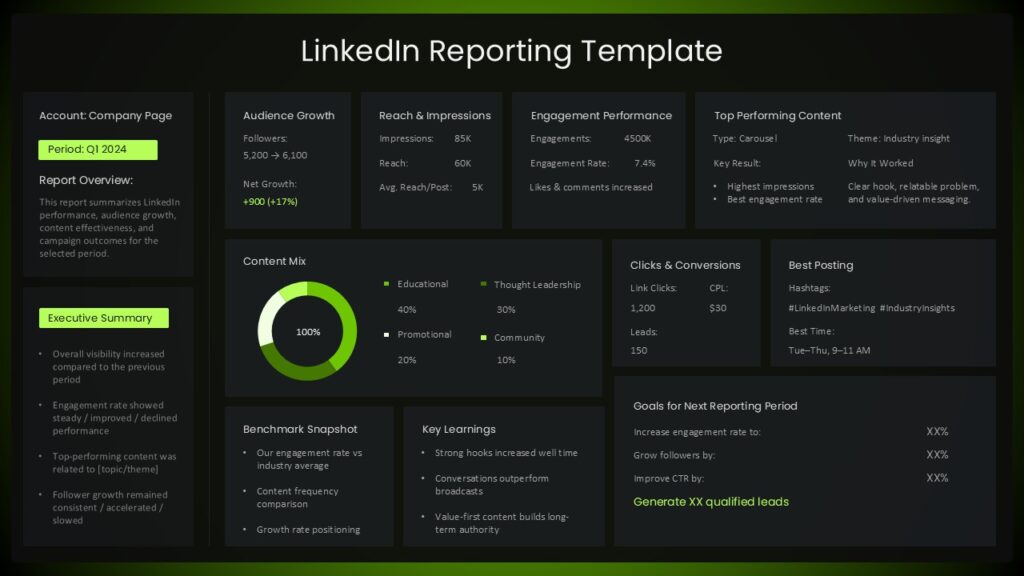 This LinkedIn performance reporting dashboard is designed to help marketing teams present campaign results, audience growth, and engagement metrics in a clear, executive-ready format. The slide uses a structured grid layout with dark panels and high-contrast highlights to showcase key indicators such as followers growth, reach and impressions, engagement rate, clicks, conversions, and content mix. Dedicated sections for top-performing content, best posting times, benchmarks, and key learnings make it easy to transform raw LinkedIn analytics into actionable insights. The circular content mix visual and KPI cards support quick scanning while maintaining a polished, data-driven appearance suitable for leadership reviews.