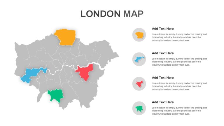 Present London-focused insights with a clean, editable city map. This slide features a vector outline of Greater London with borough borders and the Thames clearly traced in white. Four boroughs are spotlighted in contrasting colors, while matching circular badges on the right pair each highlight with a text block—ideal for notes, KPIs, or regional narratives. Subtle shadows, rounded shapes, and ample white space ensure labels stay readable and the map remains the hero. Because every element is fully customizable, you can recolor regions to match brand palettes, duplicate highlights for additional districts, or swap the icon badges for data-driven markers. Scale confidently for large screens, export to PDF, and reuse across decks without quality loss. Whether you’re comparing territories, summarizing campaign coverage, or introducing a location strategy, the balanced layout turns complex geography into an easy-to-scan visual story.