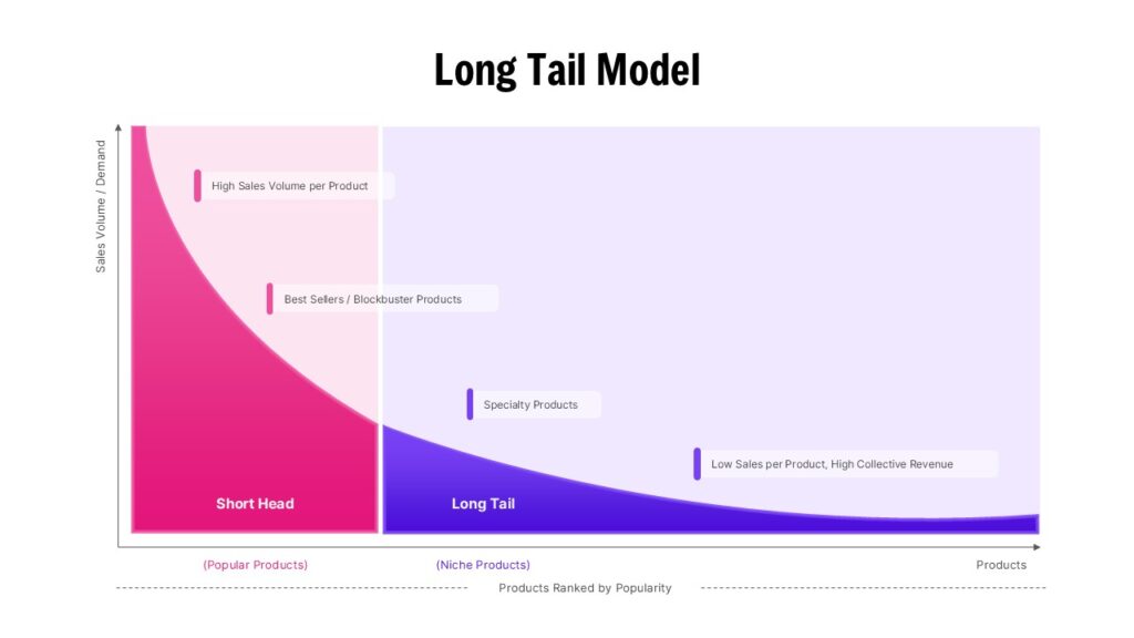 This long tail model diagram visually explains how products with low individual sales volumes can collectively generate significant revenue alongside best-selling items. The slide clearly separates the “short head” and “long tail” using a smooth, declining curve that maps sales volume against products ranked by popularity. High-performing blockbuster products appear on the left, while niche and specialty products extend across the long tail on the right. Subtle color transitions and labeled callouts make it easy to distinguish between popular products, specialty offerings, and cumulative revenue potential, ensuring the concept is instantly understandable even for non-technical audiences.