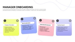 Beyond onboarding, repurpose this four-step layout to illustrate employee lifecycle stages, leadership competency frameworks, change management roadmaps, or training program outlines. It can also support executive summaries, project phase breakdowns, or strategic initiatives that require a clear, step-by-step visual narrative.
