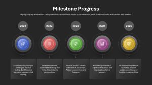 The Milestone Progress template is designed to visually track the key achievements and growth of a project, product, or business. Each milestone represents an important step forward, from initial launches to global expansions. This timeline provides a structured way to display yearly accomplishments, with each year marked by a vibrant icon that represents a key event, such as product launches, feature expansions, and business partnerships. The clear, color-coded structure helps audiences quickly grasp the timeline of progress, while the use of circular icons adds a dynamic and engaging visual element to the presentation. This template is perfect for presentations aimed at investors, stakeholders, or team members to communicate the strategic journey and highlight significant milestones achieved along the way.