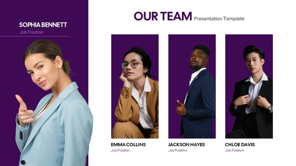 This modern team introduction profile slide template offers a sleek and professional way to showcase your company’s key team members. The design features a bold split layout with a striking purple and black color scheme that ensures each profile stands out. On the left, a highlighted section introduces a featured member with larger visual emphasis, while the right side neatly displays four additional profiles with space for names, job titles, and photographs.