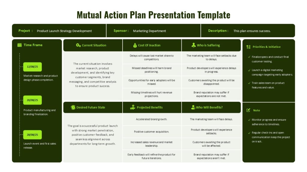 Present structured collaboration and execution clarity with this Mutual Action Plan framework slide designed for strategic alignment and accountability. The layout organizes essential planning elements into clearly defined sections, including project context, sponsor ownership, timelines, current situation, cost of inaction, impacted stakeholders, priorities, desired future state, and projected benefits. A vertical timeline on the left highlights key milestones with date markers, while the central grid-based structure guides audiences through problem definition, risk awareness, and outcome-driven planning. The right-hand panels emphasize priorities, initiatives, and notes, ensuring next steps remain visible and actionable. The clean grid, consistent iconography, and strong visual hierarchy make complex planning discussions easier to follow during executive briefings, stakeholder reviews, or cross-functional workshops.