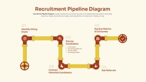 This slide features a stylized recruitment pipeline diagram that visually maps the end-to-end hiring journey, from setting clear hiring goals to reviewing outcomes. Designed as an industrial-style pipeline, the graphic uses bold yellow segments connected by rust-red elbows and circular nodes. Each node highlights a distinct phase—Identify Hiring Goals, Source Candidates, Contact Potential Candidates, Get Referrals, and Review Metrics & Outcomes—with corresponding icons for instant recognition. A bulleted list under the “Source Candidates” step provides customizable placeholders for channels such as job boards, recruiting platforms, social media, and recruiting events. The pipeline metaphor emphasizes the sequential flow of recruiting, while clean typography and ample white space ensure readability across diverse presentation settings.