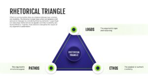 Illustrate the foundations of persuasive communication with this visually engaging Rhetorical Triangle model slide. Centered around a bold triangular diagram, the layout highlights the three essential elements of rhetoric—Logos, Pathos, and Ethos—while clearly defining their roles in effective messaging. The central triangle anchors the concept, with each corner representing logic and reasoning, emotional appeal, and speaker credibility. Supporting text areas provide space to explain how these elements interact to strengthen arguments and presentations.