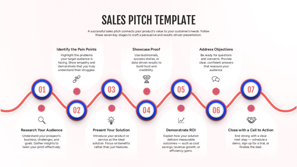 The seven stages—researching your audience, identifying pain points, presenting solutions, showcasing proof, demonstrating ROI, addressing objections, and closing with a call to action—are arranged to reinforce logical storytelling. This structure helps sales teams align messaging with buyer psychology while maintaining momentum throughout the pitch. Fully editable shapes, text placeholders, and colors allow quick customization to match brand guidelines or specific industries. Optimized for PowerPoint and Google Slides, the layout ensures consistent formatting, sharp visuals, and seamless collaboration across platforms.