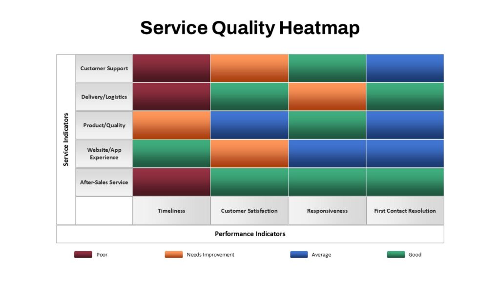 Evaluate your service quality with this visual heatmap template. The chart is divided into two key axes: Service Indicators on the left (Customer Support, Delivery/Logistics, Product/Quality, Website/App Experience, and After-Sales Service) and Performance Indicators at the top (Timeliness, Customer Satisfaction, Responsiveness, and First Contact Resolution). Each cell is color-coded to represent performance levels, from Poor (red) to Good (green), with intermediate colors to show areas that need improvement or are performing at an average level.