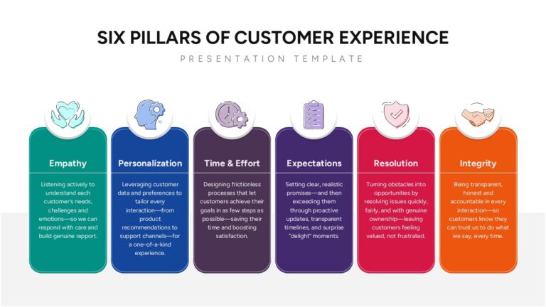 Showcase the fundamentals of customer-centric business strategies with this Six Pillars of Customer Experience Framework template for PowerPoint and Google Slides. Designed with a professional and engaging layout, this slide highlights the six key dimensions—Empathy, Personalization, Time & Effort, Expectations, Resolution, and Integrity—that shape exceptional customer experiences. Each pillar is presented in a vertical rectangular block with unique icons and vibrant color coding, ensuring clarity and visual impact.