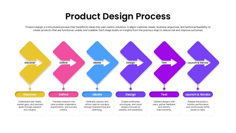 Showcase your innovation journey with this Product Design Process Flow Diagram Template for PowerPoint & Google Slides. Designed as a six-step horizontal progression, this slide clearly maps the complete product lifecycle: Discover, Define, Ideate, Design, Test, and Launch & Iterate. Each phase is represented with bold, angled arrow shapes and vibrant color coding, visually guiding audiences from research and problem identification through validation and continuous improvement.