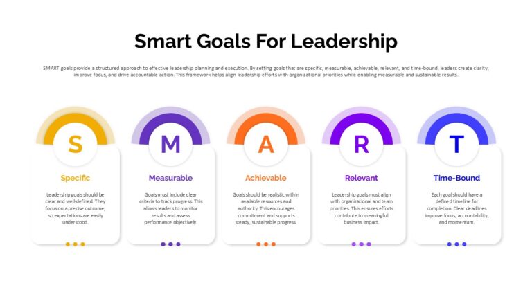 Drive focused and accountable leadership planning with this SMART Goals for Leadership Strategy Template for PowerPoint & Google Slides. Designed around the proven SMART framework—Specific, Measurable, Achievable, Relevant, and Time-Bound—this slide presents five visually distinct pillars in a clean horizontal layout. Each goal component is highlighted with a bold initial letter inside a circular badge and paired with a semi-arc accent in vibrant colors, creating strong visual segmentation while maintaining a cohesive, modern design.