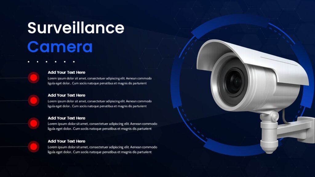 Present security concepts with clarity and impact using this surveillance camera overview slide designed for modern business and technology presentations. The layout features a high-resolution 3D CCTV camera illustration positioned on the right, balanced by structured text placeholders on the left for key points, features, or benefits. A dark blue gradient background with subtle hexagonal patterns and circular UI accents reinforces a high-tech, professional tone, making the slide ideal for cybersecurity, monitoring, and safety-focused topics. Red circular markers guide audience attention across multiple text lines, helping presenters communicate layered information in a clear, sequential manner. Fully editable text fields allow quick customization of headings, descriptions, and emphasis points without disrupting visual balance.