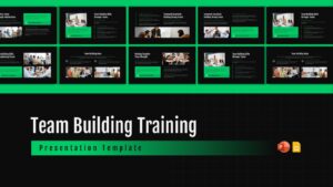 This comprehensive Team Building Training presentation template features 10 professionally designed slides that combine theoretical concepts with practical applications. The template uses a modern black background with vibrant green accents, creating high contrast and excellent readability. Each slide focuses on key aspects of team building including collaboration principles, effective communication strategies, trust-building exercises, and teamwork essentials. The design incorporates professional team photography alongside structured content layouts, timelines, and call-out boxes that highlight important concepts. Compatible with both PowerPoint and Google Slides, this template provides a complete framework for delivering impactful team building training sessions.