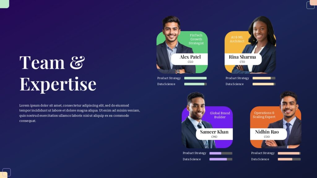 The left-aligned header “Team & Expertise” sets a bold introduction, while the clean typography and structured design maintain a professional yet engaging aesthetic. The inclusion of progress bars beneath each profile adds a visual representation of skills, reinforcing credibility and clarity. With full customization options, you can easily edit photos, names, designations, colors, and skills to match your organization’s branding. Whether introducing your executive team, project members, or departmental leads, this slide enhances professionalism and fosters audience trust.