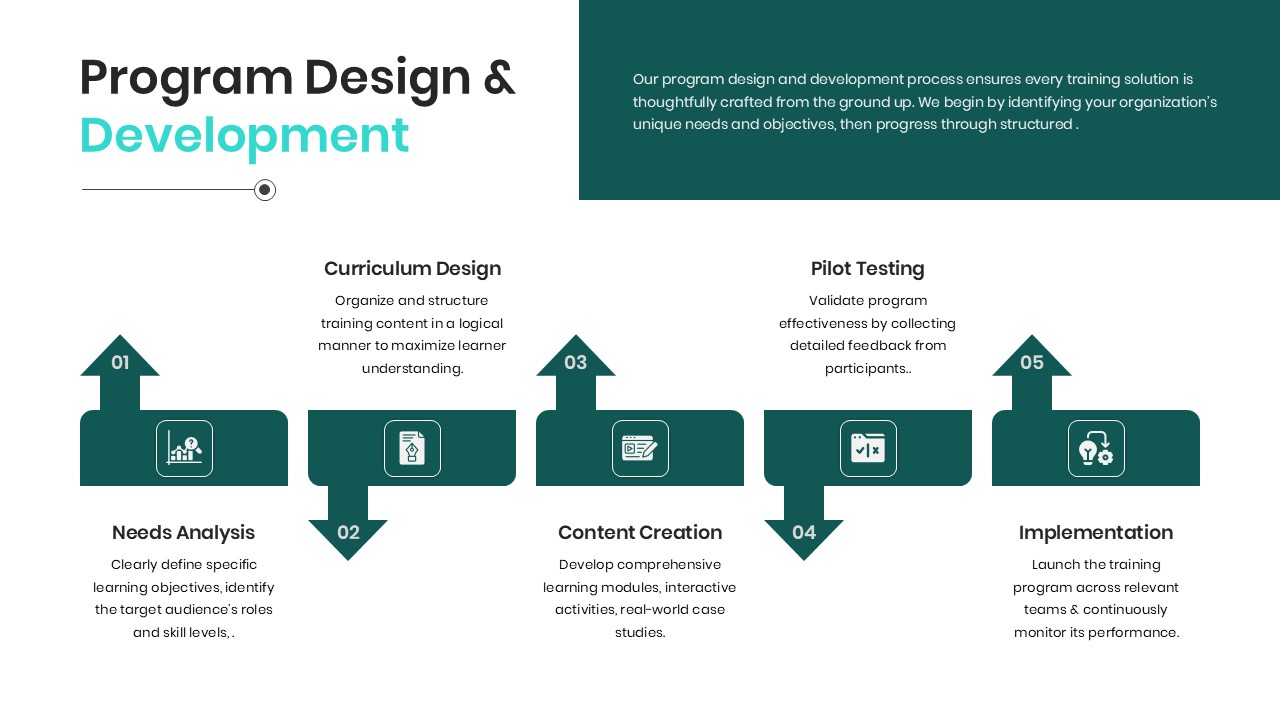 Each slide is crafted to communicate professionalism while remaining visually engaging. The mix of image placeholders, icons, and structured content blocks ensures easy customization to suit your brand identity. Complex processes like skill gap analysis, curriculum design, and hybrid learning delivery are presented in clear, step-by-step visuals that simplify understanding for clients and stakeholders.