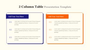 Present side-by-side comparisons with this clean, two-column table template. Each column features a bold header for your titles, followed by numbered lists for details, making it ideal for structured breakdowns or pros-and-cons comparisons. The left column is styled with a blue header, and the right column with an orange header, allowing you to differentiate two sets of data, options, or steps. The soft background color and clear typography make it easy to read, while the table structure keeps your content organized. Everything is fully editable—change headings, update text, and even adjust the column colors to suit your brand. This simple layout is perfect for comparing strategies, outlining project plans, or listing features in presentations. Optimized for both PowerPoint and Google Slides, the template scales well for print or PDF exports.