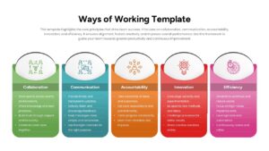 Define and reinforce team alignment with this structured Ways of Working slide designed to communicate shared principles clearly and consistently. The layout presents five vertically aligned pillars—Collaboration, Communication, Accountability, Innovation, and Efficiency—each housed in a rounded card with a distinct color and icon. This column-based structure helps audiences quickly scan and understand expectations while visually separating each principle without losing cohesion. The clean white background and balanced spacing ensure readability, while the subtle shadows and icons add a modern, professional finish suitable for corporate environments.